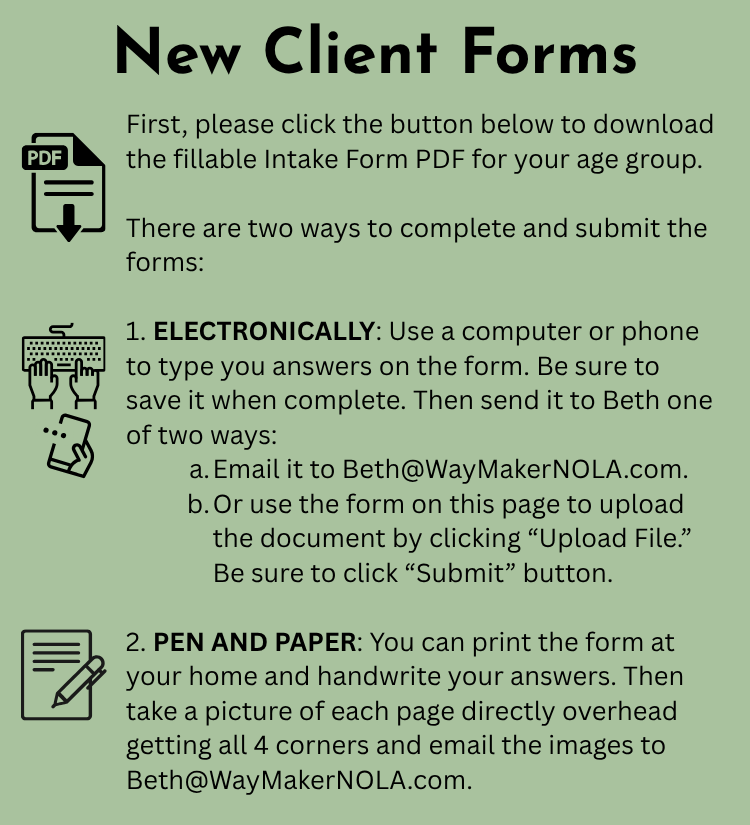 Please fill out the form below to get in touch with Beth Maillho or to securely send documents. Your message will only be read by Beth. In the body of the message, you can let her know your preferred method of contact and if she may leave text or voice messages. Click "Upload File" to send your completed intake form. Thank you!